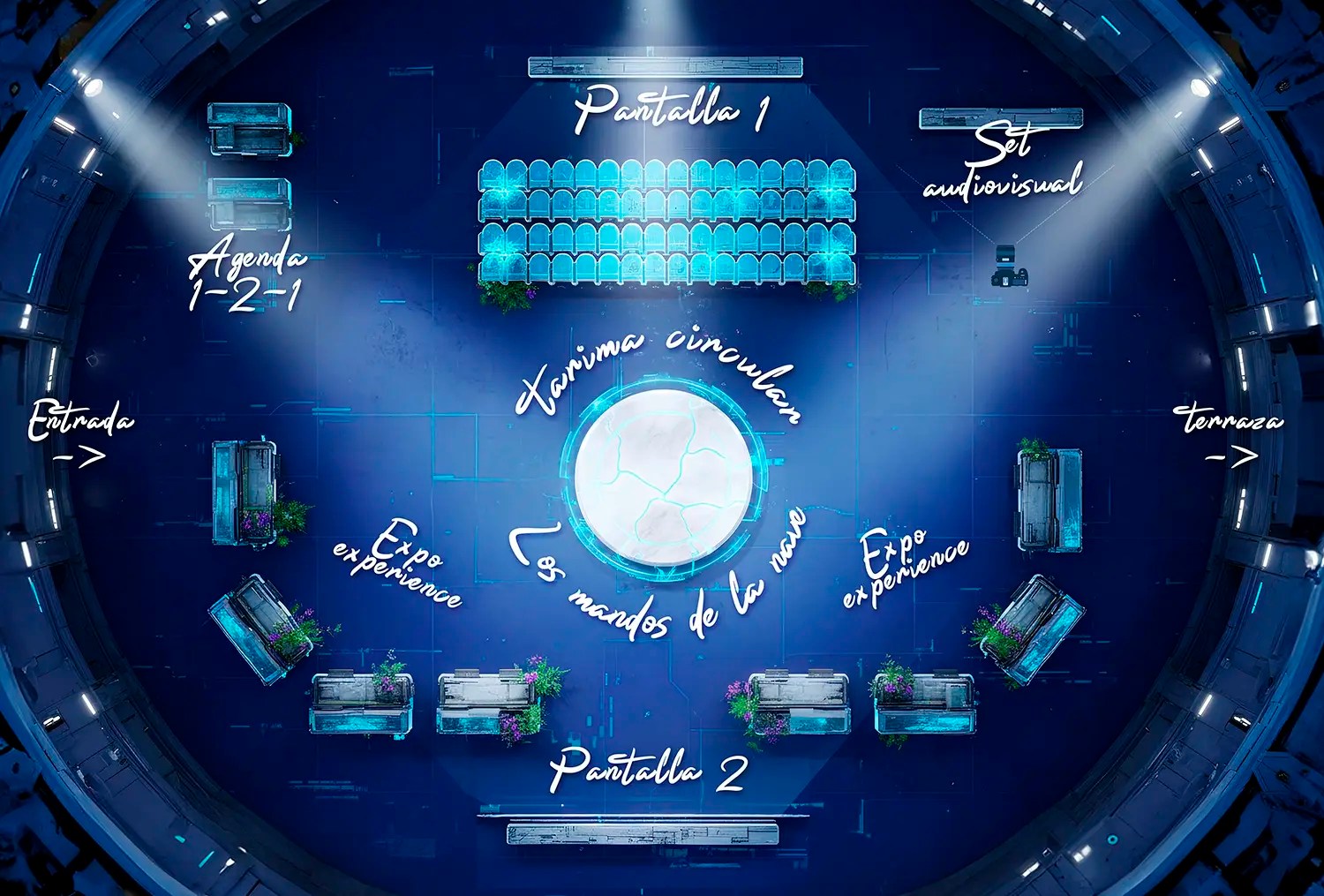 En el centro, una tarima circular actúa como punto de activación del evento: un espacio compartido para intervenciones, debates y momentos clave, integrado en la dinámica general y no aislado del resto de la experiencia.